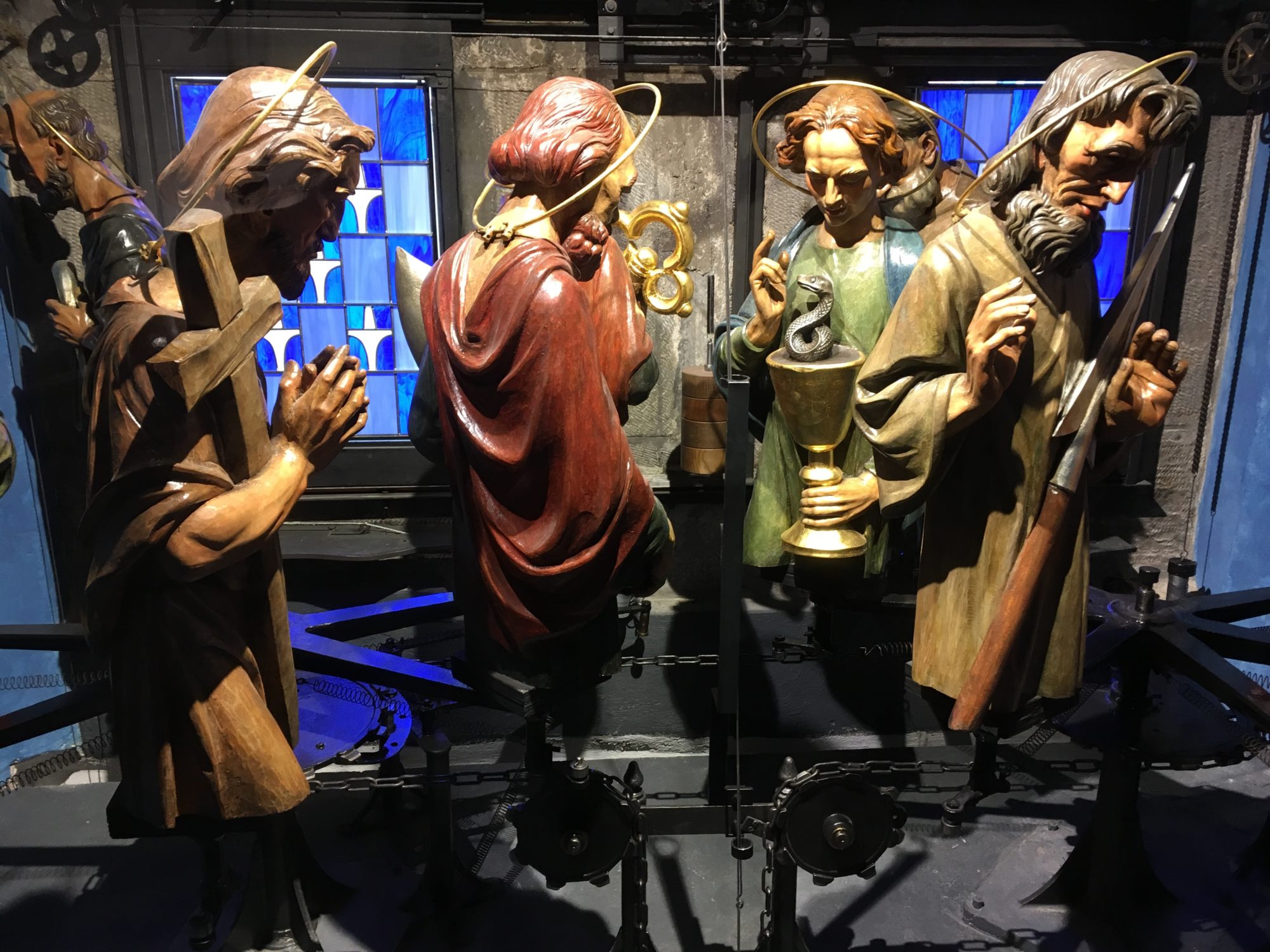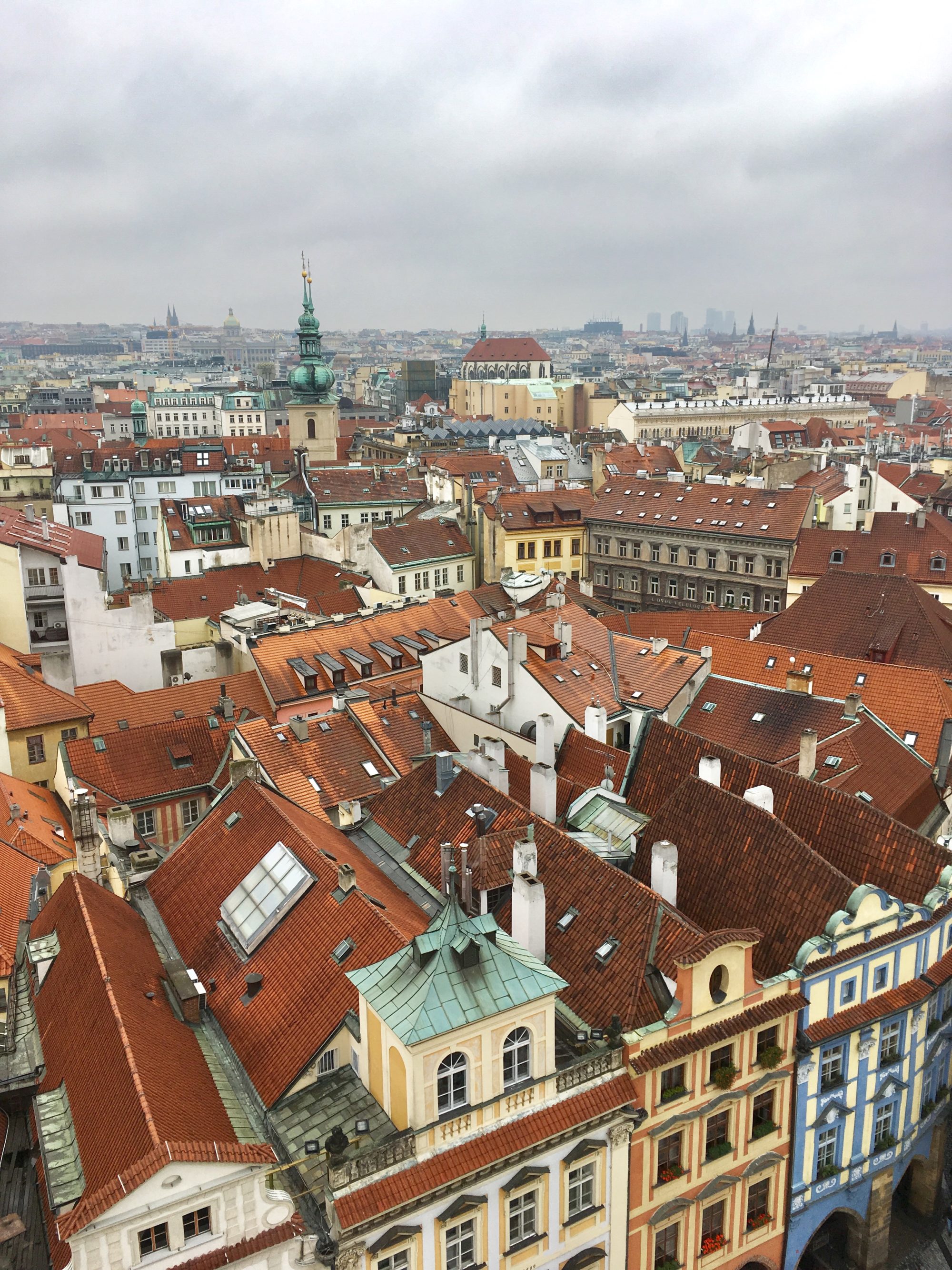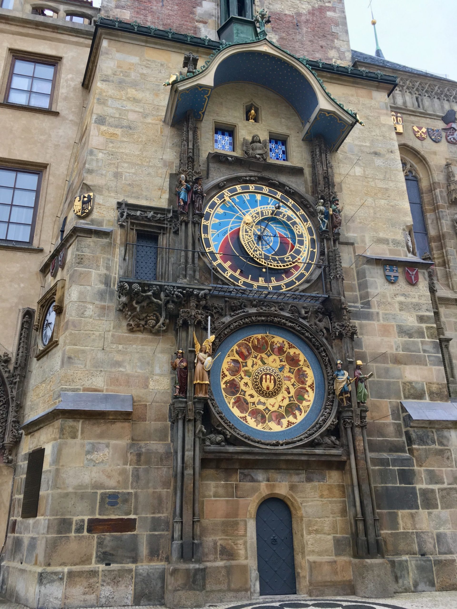 3e jour à Prague et nous n’avions toujours pas pris le temps d’aller voir l’horloge astronomique, pourtant incontournable. C’est donc dès l’ouverture que nous décidons de nous y rendre afin d’éviter l’affluence massive. Le cadran, très impressionnant permet de donner pas moins de huit informations différentes, l’heure moderne, bien sûr mais aussi la phase lunaire, l’heure en douzième de jour ou encore le signe astrologique zodiacal dans lequel on se trouve ! Toutes les heures (de 9h à 21h), le squelette brandit son sablier et les personnages en façade commencent à s’animer en façade et les douze apôtres font leur apparition. Il faut donc se trouver en bas de la tour à l’heure pour ne pas manquer ce petit spectacle.