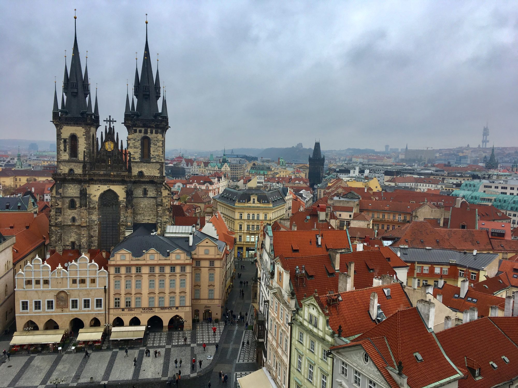 En ressortant de l’hôtel de ville, nous profitons d’être dans le quartier pour aller voir la petite place malé námēstí puis la grande place de la vieille ville. Une petite visite de l’église Saint Nicolas permet d’admirer l’un des plus beaux lustres en cristal de Bohème que je n’ai jamais vu. Puis nous repartons par l’église Notre-Dame-de-Tyn et la rue Celetná. Cette petite rue, très commerçante, permet de faire quelques emplettes (notamment chez Manufaktura) tout en profitant de l’atmosphère pragoise. A la fin de la rue, on tombe directement sur la tour poudrière et la magnifique maison municipale.
