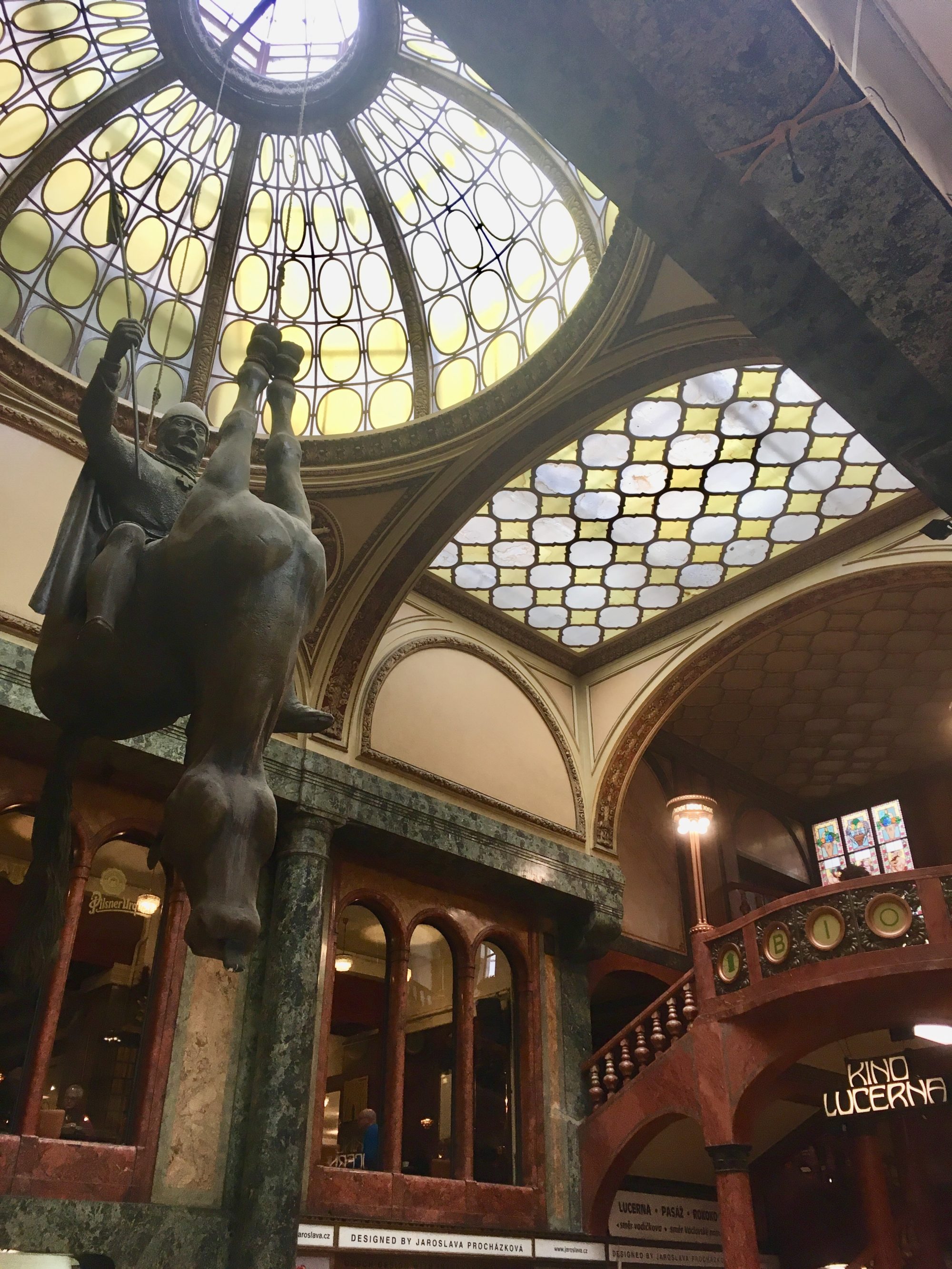 Pour continuer cette journée, nous nous sommes baladés dans la nouvelle ville. J’avais vraiment envie de voir la boutique du Musée Mucha ainsi que quelques passages. Le passage Lucerna, bien sûr, mais aussi le Světozor ou le Adria. Nous en avons aussi profité pour traverser le Jardin Franciscain et descendre la place Venceslas jusqu’au Musée National où nous avons pris le métro pour aller voir le deuxième château.